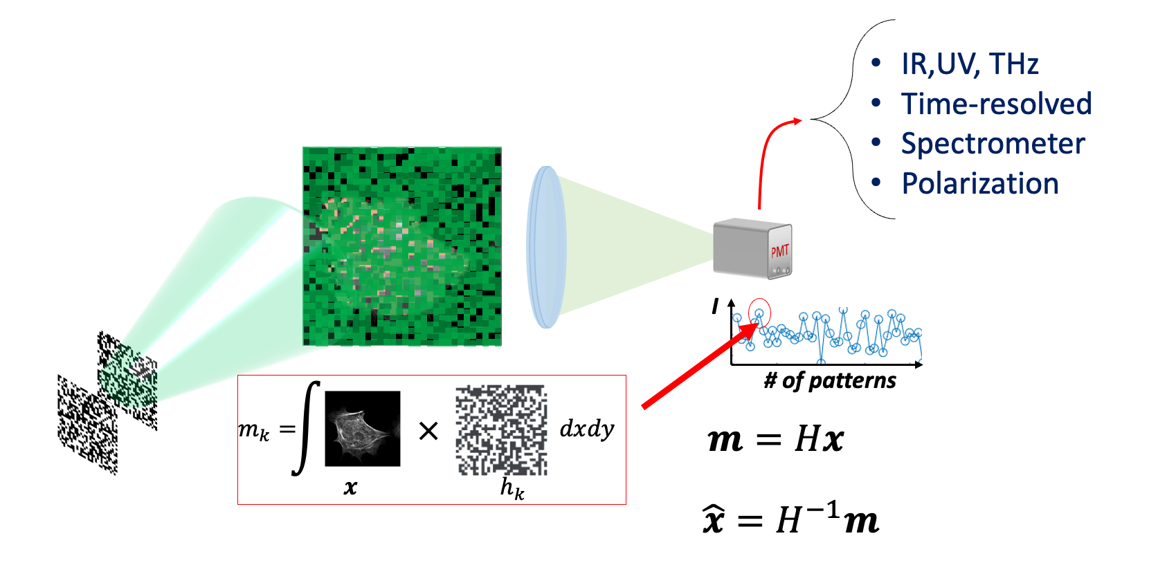 Developed at the RICE University, single-pixel imaging allows imaging through a single-element detector (also called “bucket detector”) taking advantage of spatial light modulators, such as a Digital Micromirror Device (DMD). A series of spatial patterns are overlapped to the target image and the resulting light is focused on a single-element detector. After a reconstruction phase that can range from a simple matrix inversion to a more complex constrained minimization, the target image is eventually reconstructed. The fact that we can compress the spatial dimension into a single-element detector opens the way to exploring other dimensions (such as lifetime, spectrum, polarization, and depth) or other spectral ranges where cameras are not available.