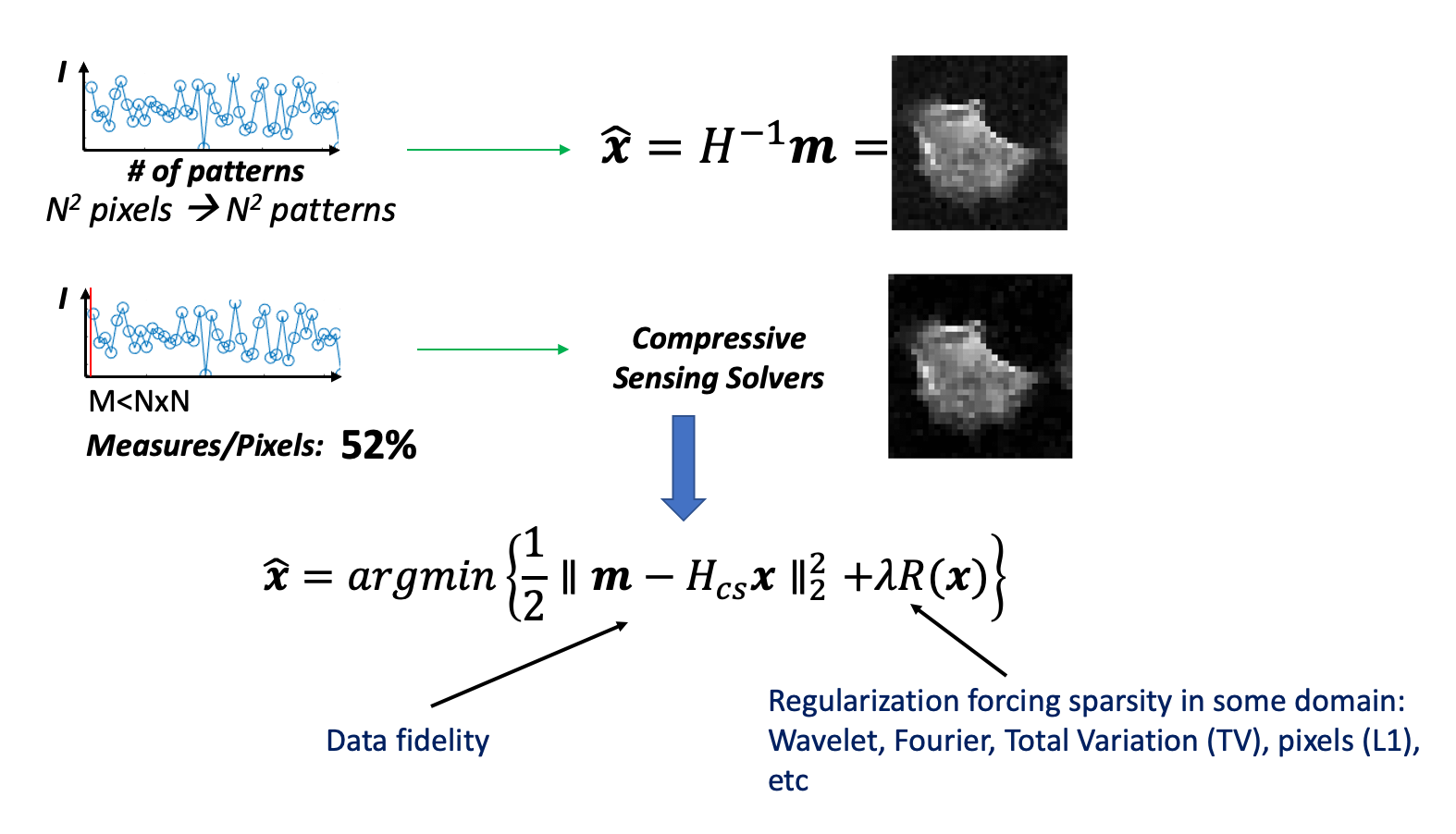 This computational framework allows the recovery of an image which has a sparse representation by a number of measurements that is much less than the number of pixels. This can be done by a constrained minimization enforcing sparsity in different domains (e.g. pixel, gradient, Wavelet, etc.).