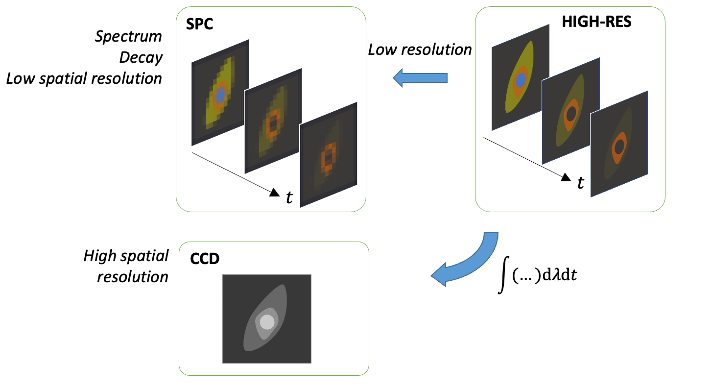 Developed in collaboration with the Photonics Research Group (GROC) @ UJI (University Jaume I) this technique allows us to fuse together datasets obtained with different detectors. In particular, we have recently applied and published this technique to recover a high-resolution 4D hypercube (space, time on the ps, spectrum) by fusing a low-resolution multi-dimensional microscopy dataset derived bt a low-resolution single-pixel camera and a high-resolution image obtained by a CMOS camera.
