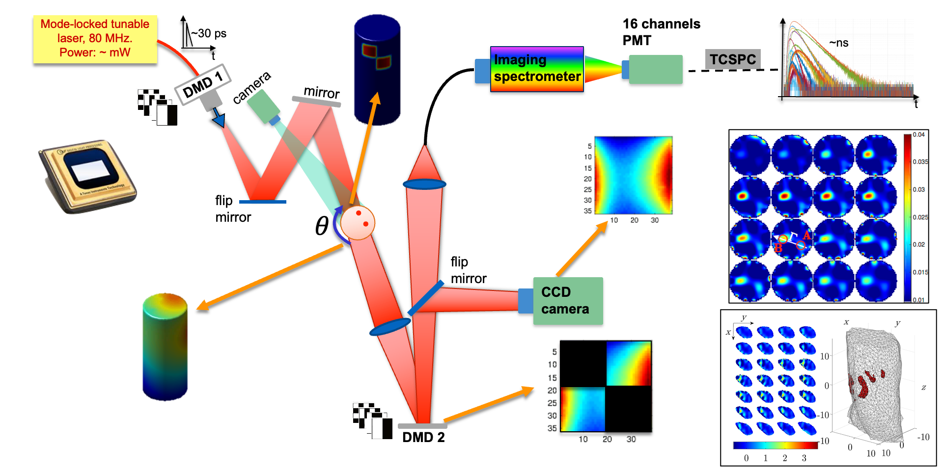 The system allows the 3D mapping of absorption and scattering in diffusive media. Making use of the time-resolved technique it is possible to discriminate absorption and scattering. The system embeds two DMDs for both structured illumination and single-pixel detection.