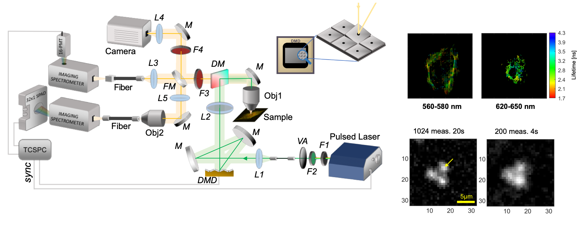 The system allows for the multidimensional mapping of the fluorescence emission from biological samples on the microscopy scale. The system embeds a DMD for structured illumination and different output paths for exploring both multi-spectral and high-throughput time-resolved single-pixel imaging in collaboration with the Department of Electronics @ Politecnico di Milano.
