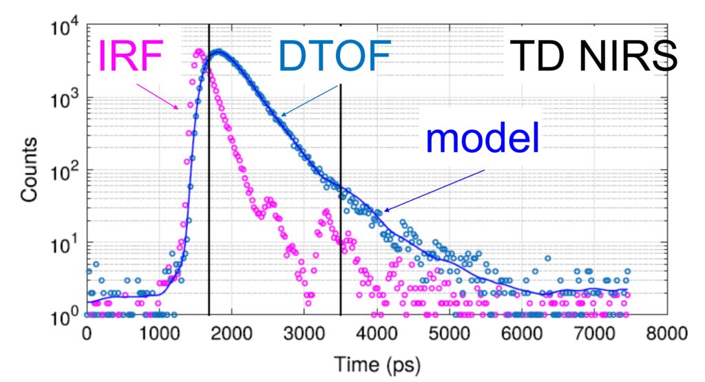 TD-NIRS measurement and analysis scheme: IRF, Instrument Response Function; DTOF, Distribution of Time-of-Fly; model, mathematical model describing photon migration.