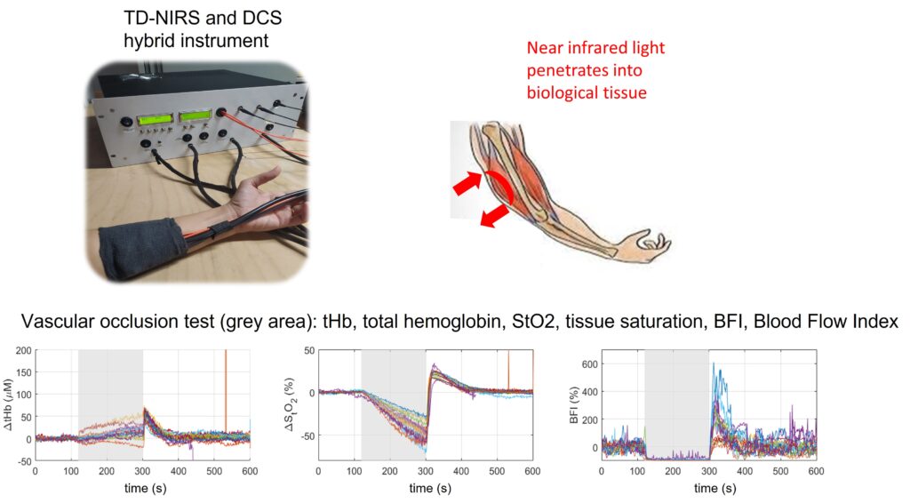 More recently TD-fNIRS instrumentation has been integrated with a new developed instrument based on the Diffusion Correlation Spectroscopy (DCS). This technique relies on the light intensity decorrelation determined by red blood cells movement in the tissue, allowing to have an estimation of the bool flow. The combination of the hemoglobin concentrations and blood flow allows to give an estimation of the metabolic rate of oxygen consumption.